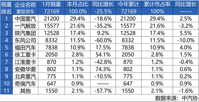 2025年1月份,我國重卡市場共計銷售72169輛,環比下降14.3%,與(yu) 上年同期相比下滑25.5%,出現環比、同比雙降的局麵。然而強者恒強,中國重汽憑借超凡產(chan) 品實力逆勢突圍,開啟首月“爆單”模式——1月實現重卡銷量21200輛,市占率可達29.4%,同比增長2.5%,開局斬獲行業(ye) 銷量、市占率“雙冠軍(jun) ”!這份開年答卷,不僅(jin) 彰顯其行業(ye) 領跑者的硬核實力,更以產(chan) 品、服務、技術的全麵升級,為(wei) 商用車市場注入一劑強心針。