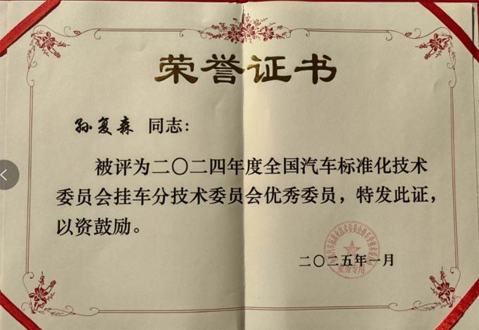 近日,從(cong) 全國汽車標準化委員會(hui) 掛車分技術委員會(hui) (以下簡稱掛標委)傳(chuan) 來喜訊,昌龍掛車董事長孫複森憑借其在掛車行業(ye) 的卓越貢獻和專(zhuan) 業(ye) 成就,榮膺全國汽車標準化委員會(hui) 掛車分技術委員會(hui) 2024 年度優(you) 秀委員稱號,這是繼2019年後連續6年獲得掛標委優(you) 秀委員殊榮。