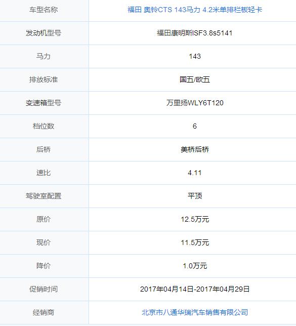福田 奧鈴CTS 143馬力 4.2米單排欄板輕卡(BJ1048V9JEA-FE)裝配平頂駕駛室,動力方麵,搭載福田康明斯ISF3.8s5141發動機,輸出功率為(wei) 143馬力,符合國五/歐五排放,匹配萬(wan) 裏揚WLY6T120變速箱,檔位數為(wei) 6,采用美橋後橋,速比為(wei) 4.11,對該款新車有購買(mai) 意向的用戶歡迎致電經銷商。